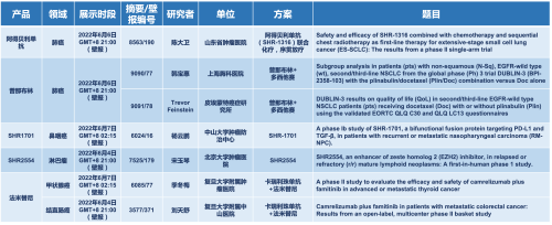 2022 ASCO年会另有5款九游会·J9医药上市前抗肿瘤创新药的相关研究被接收为壁报,包括SHR-1316、普那布林、法米替尼、SHR-1701和SHR2554,他们的单药或联合方案相关7项研究被接收为壁报,覆盖肺癌、鼻咽癌、淋巴瘤、甲状腺癌和结直肠癌等领域。